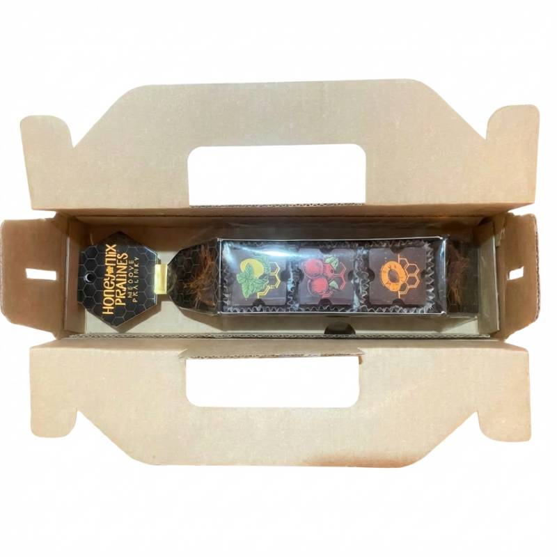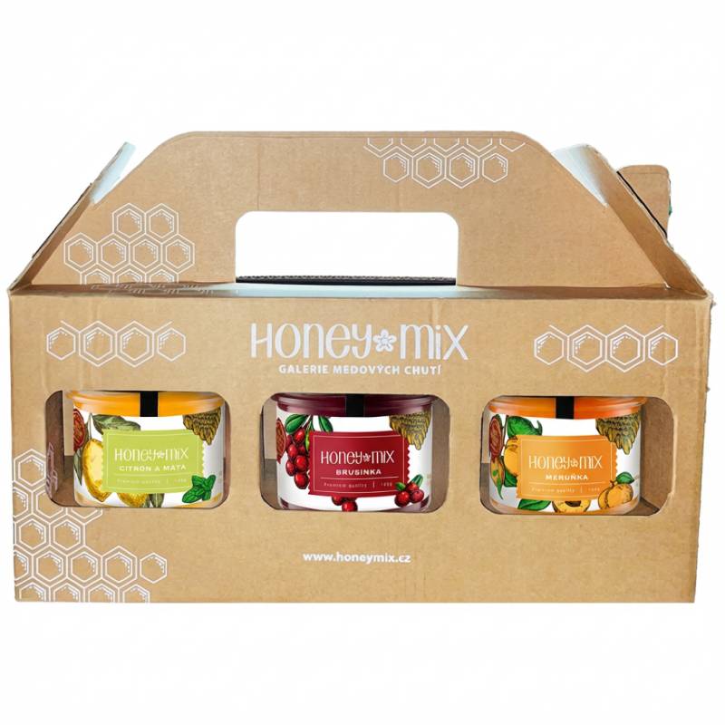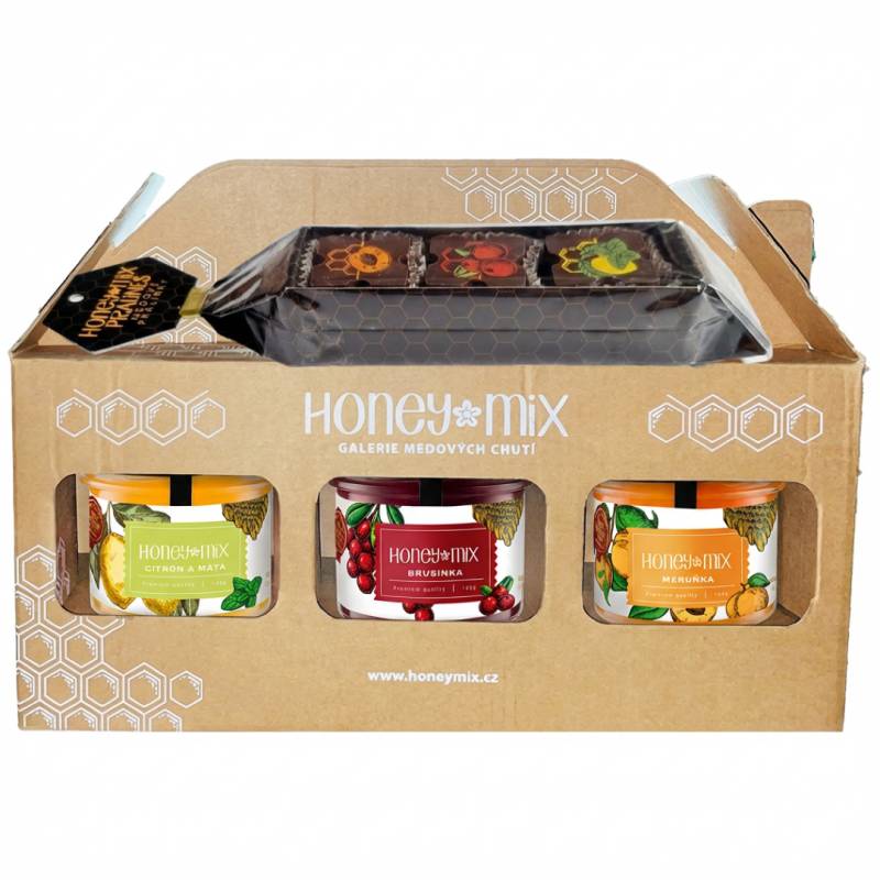 Elegantní dárková krabička obsahuje 3 ochucené medy HoneyMix a 3 medové pralinky ve stejných příchutích.