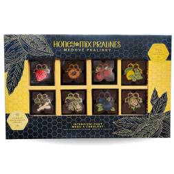 Medové pralinky, to je prémiová čokoláda a vynikající ochucený med Honeymix – dokonalé spojení chutí v jedinečnou pochoutku. Výběrová 71% hořká čokoláda z Ekvádoru a skvělý med ochucený ovocem, kakaem a ořechy.